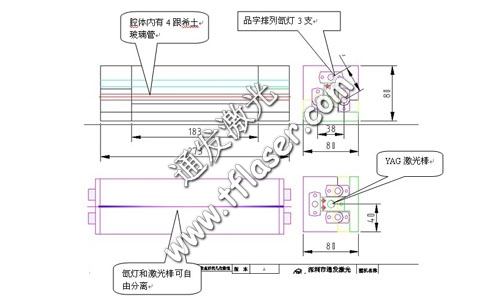 1本激光器采用全銅度純金反光瓦,三支燈管承品字排列,激光棒中間。
